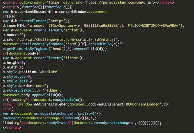 - Un fragmento de código JavaScript que crea un iframe oculto de 1x1 píxeles, dentro del cual inyecta código que imita recursos legítimos de Cloudflare como “cdn-cgi/challenge-platform/scripts/jsd/main.js”, una API esencial de su plataforma de detección y desafío de bots;