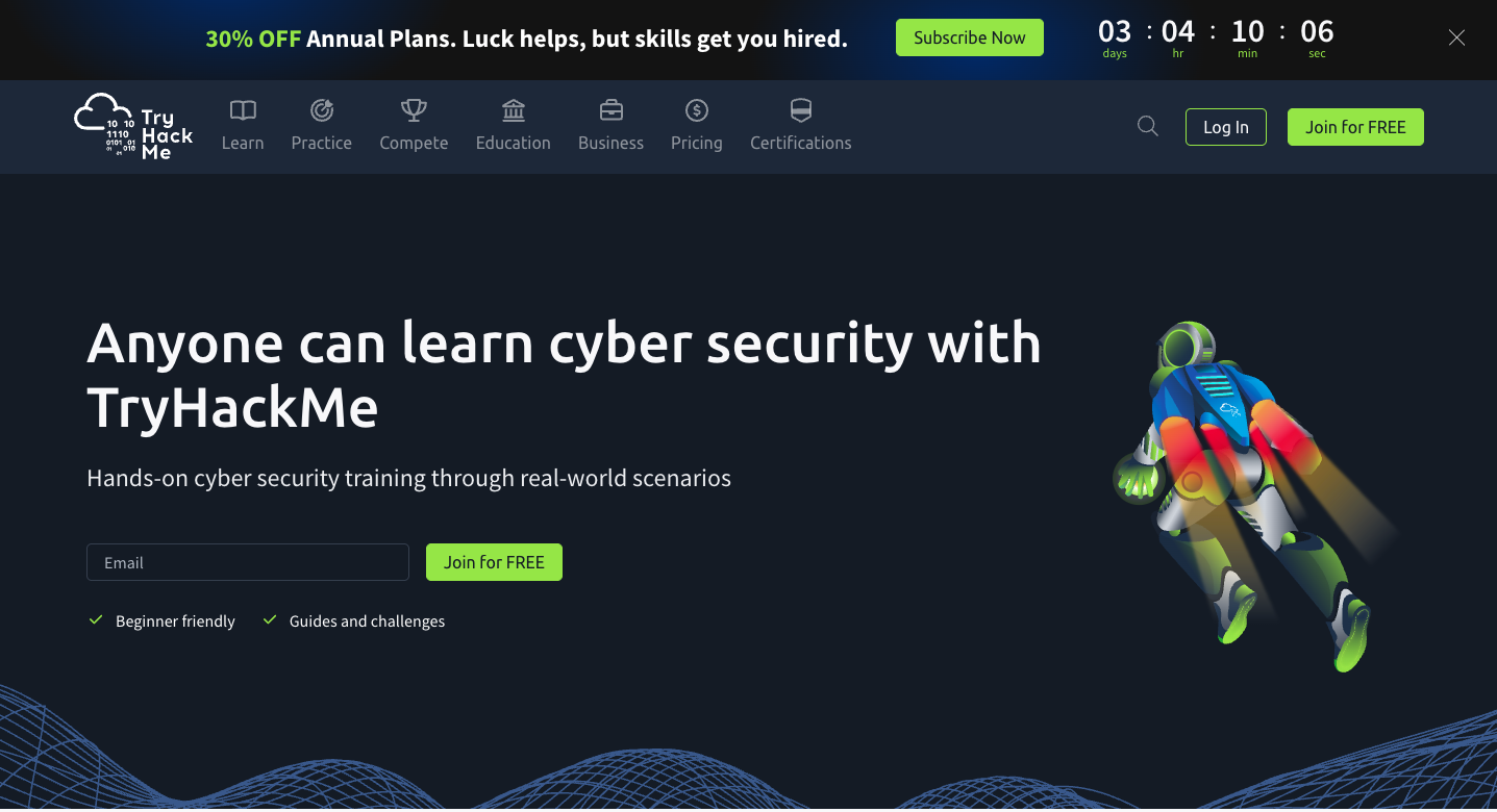 TryHackMe es una de las plataformas más populares para aprender ciberseguridad desde cero. Utiliza laboratorios interactivos llamados rooms, donde los usuarios deben completar ejercicios prácticos relacionados con seguridad informática.