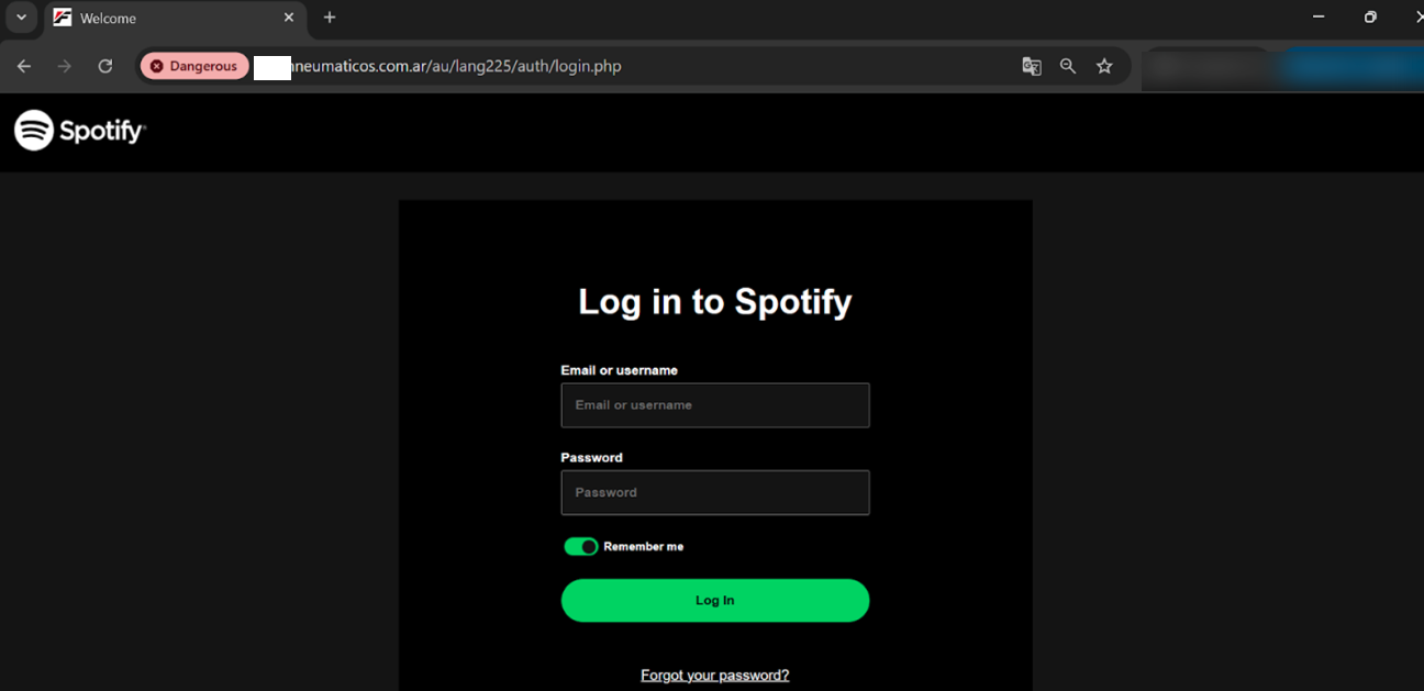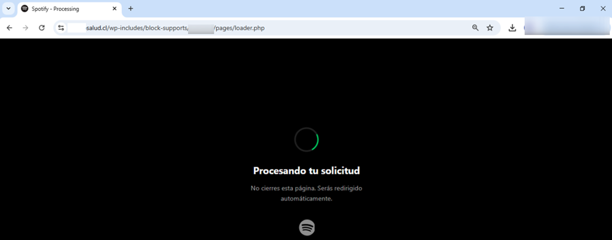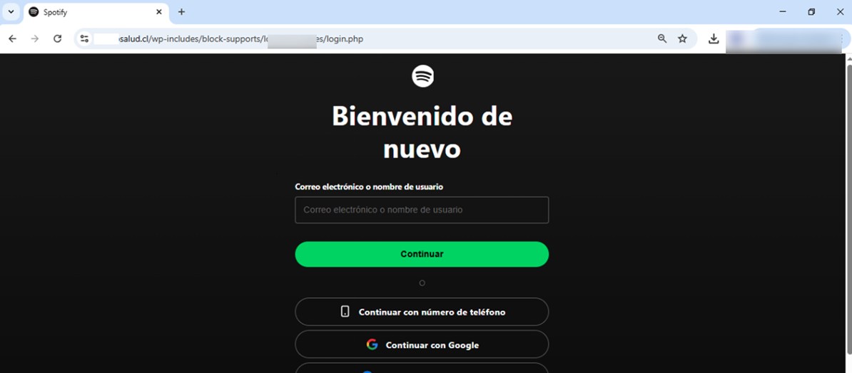 En los últimos días se detectaron dos casos en los que la marca suplantada es Spotify, y donde los ciberdelincuentes aprovechan sitios comprometidos de pymes de la región para alojar páginas que simulan ser de este servicio de streaming dentro de un dominio legítimo.